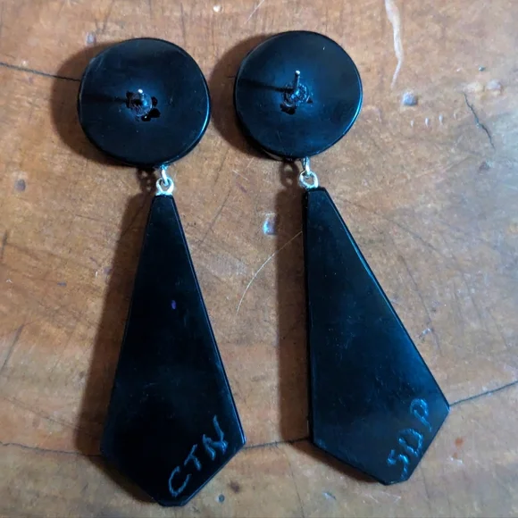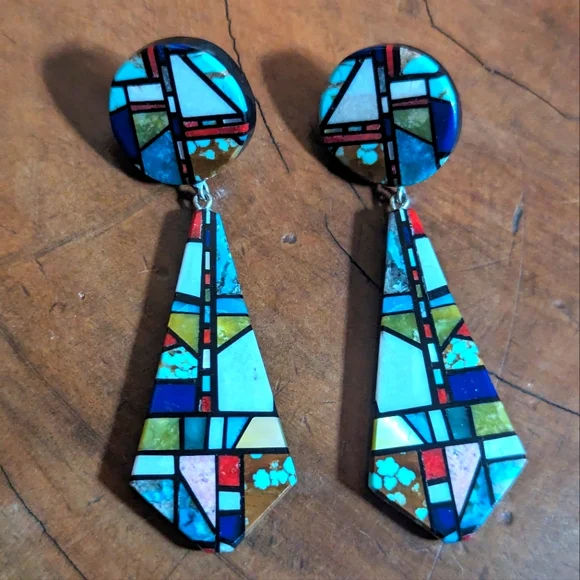Beautiful handmade Inlayed post earring are by Christopher Thomas Nieto, a member of the Santo Domingo Indian Pueblo. The backside of the earrings are natrual Jet stone with signed etchings SDP and CTN. The Jet stone is also used for all the line work between all the other natural stones, Coral, #8 Turquoise, Kingman Turquoise, Lapis, and mother of pearl and more!Measurements Estimate: length 2.5/8"( 2.1/4"long from post to bottom),top circle diameter 3/8", bottom shape 1.3/4"long thickest 1/2" wide.