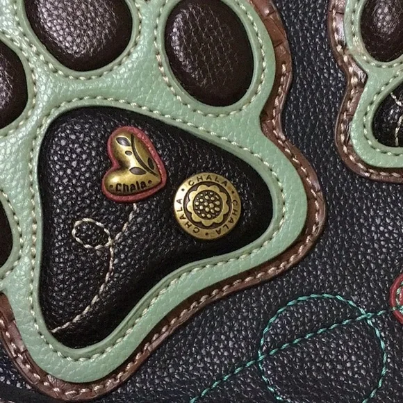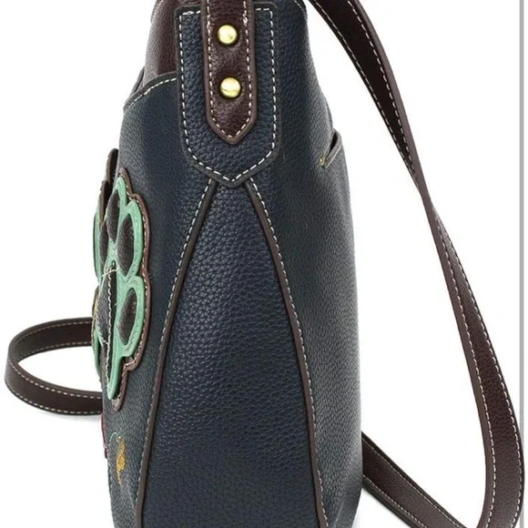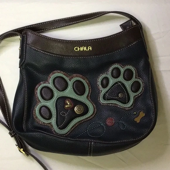 • Chala Paw Print Crescent CrossbodyHandbag Purse• Approx. Measurements: 10"Wx10.5"Hx3"D• Adourned with faux leather Paw Print ChalaPal Adjustable shoulder strap Top & Front zipper pockets Rear closure pocketsPatterned fabric lining with slide and zipper pockets Materials: Faux leather Color: NavyDescriptionPaw Print - Crescent Crossbody Stylish, compact, versatile Adourned with faux leather Paw Print Chala Pal Adjustable shoulder strap Top & Front zipper pockets Rear closure pockets Patterned fabric lining with slide and zipper pockets Materials: Faux leather Color:NavyDesigned in California, USAF24