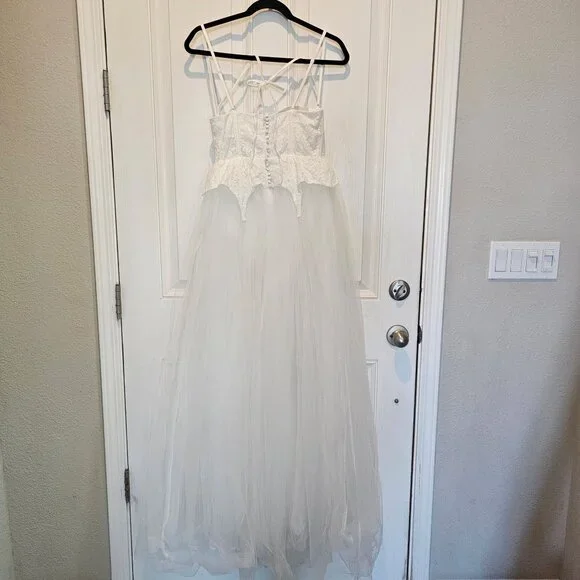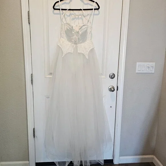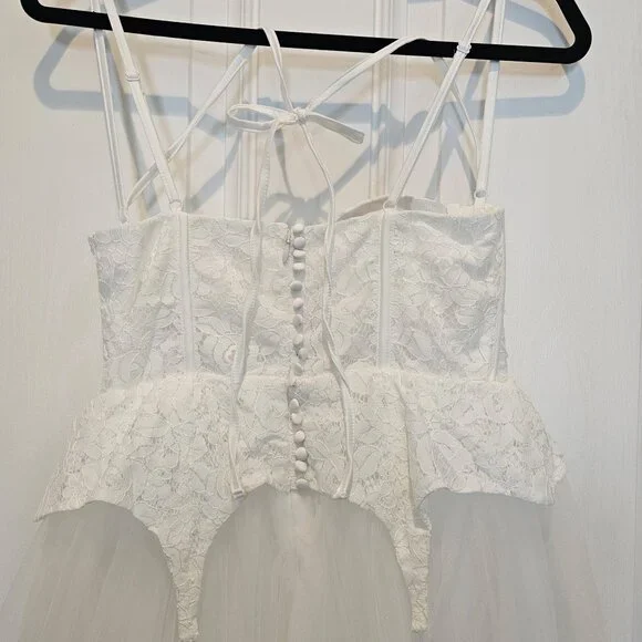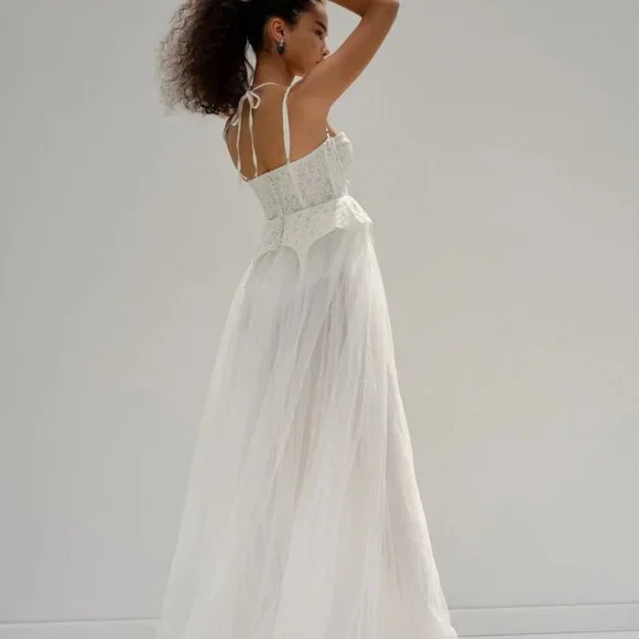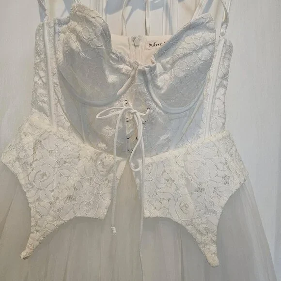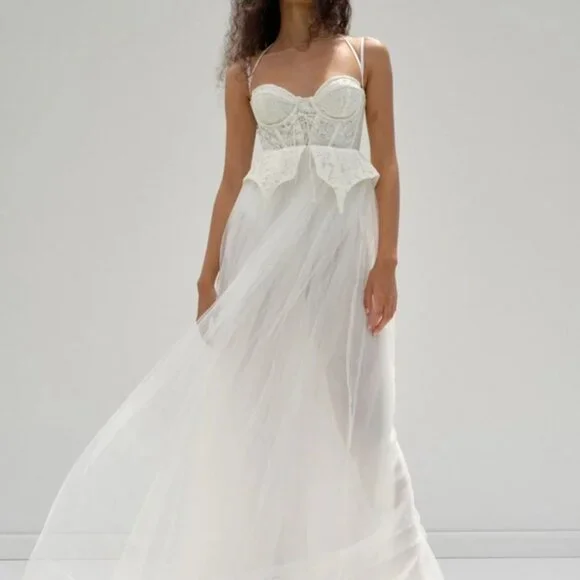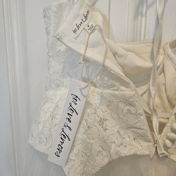NWT | For Love & Lemons Liily Bridal Corset Top Tulle Skirt Maxi Look Dress MNew with tagsStyle NotesCorset style bodiceCenter-front lace up detailSheer tulle skirtChiffon LiningBuilt-in pantyLace Peplum detailsFabric + CareSelf: 100%Nylon; Contrast 1: 100% Nylon; Contrast 2: 97% polyester/ 3% Spandex; Lining:98% Recycled Polyester/ 2% SpandexTags: bridal, wedding, honeymoon, bachelorette, second look, photo shoot, destination wedding, anthropologie