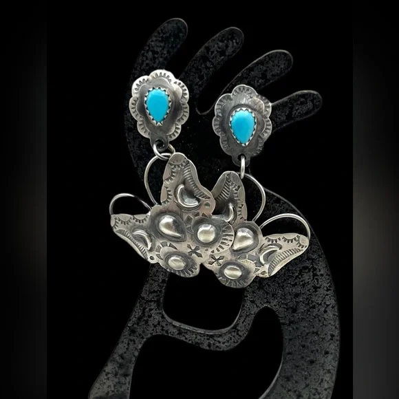 Rolanda Yazzie Signed Navajo Sterling Silver Turquoise Butterfly Dangle EarringsOrders totaling $100 and up include an anti-tarnish treated velvet jewelry pouch! Earrings measure approximately 1.75” X 1 1/8”Weight is approximately 6.5 gramsCondition: NewMetal: Sterling SilverSee photos for hallmarkComes in a gift box