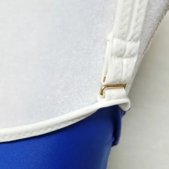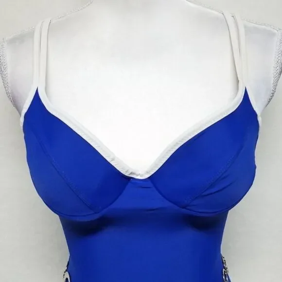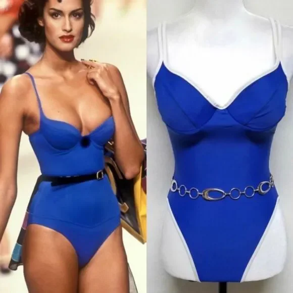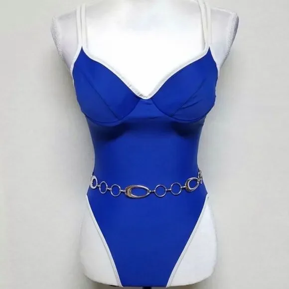 Vintage blue and white belted pinup swimsuit by Anne Cole Collection. Sexiest one piece ever!Cobalt blue with white piping around legs and straps.Extra high rise sides with straps that can be racerback.Wired push up bra top with thick foam inserts. Silver belt with a hook closure.Very light piling under belt.Made in the USA!Size 6.Approximate Measurements:Bust (Right Under Cups) - 15 inchesWaist - 10.25 inchesLength (Bust To Rise Seam) - 19 inchesVintage, Retro, Pin-up, Sexy, Swim