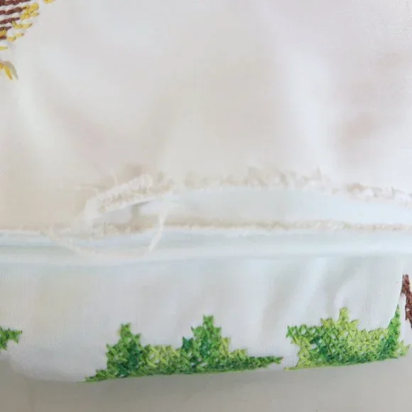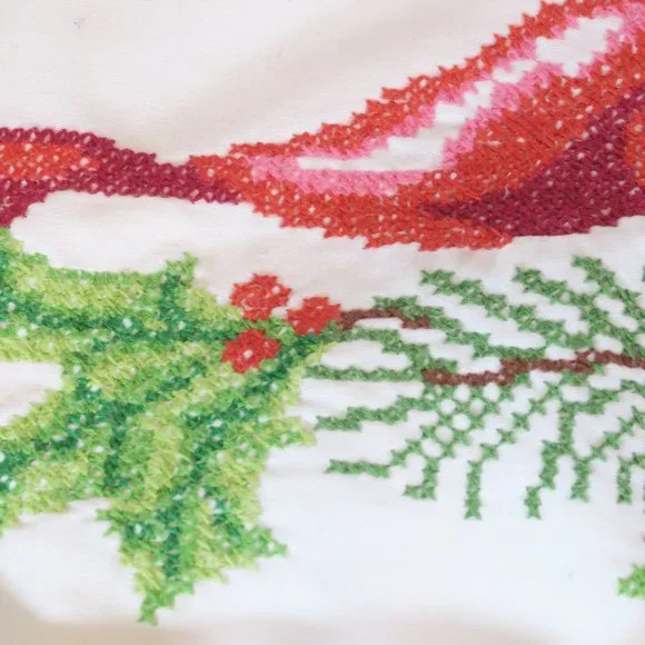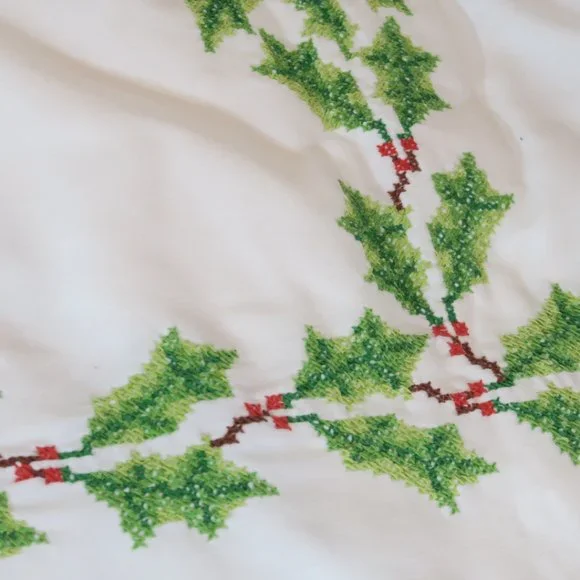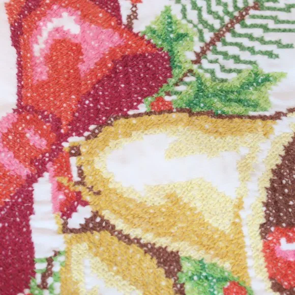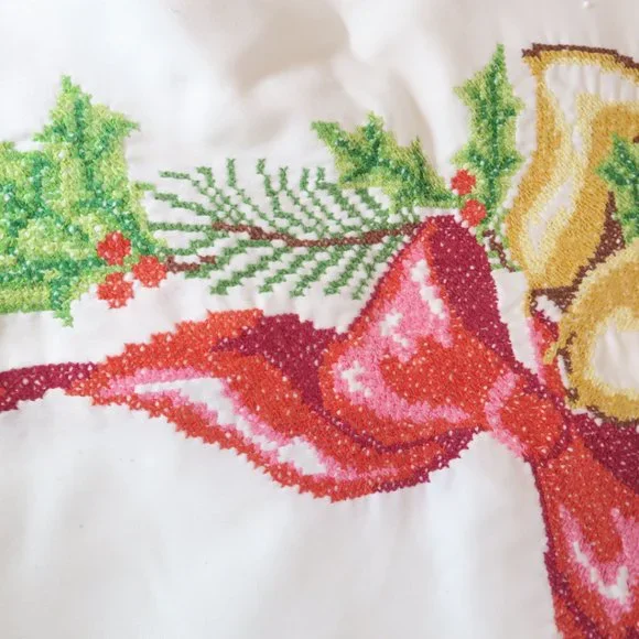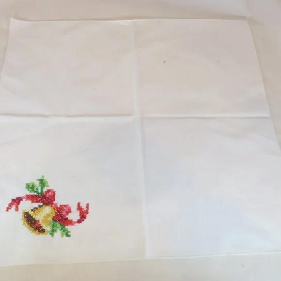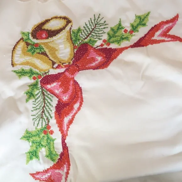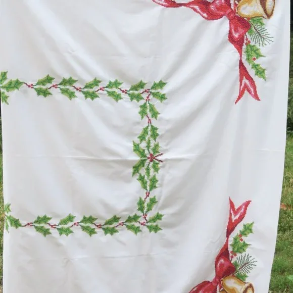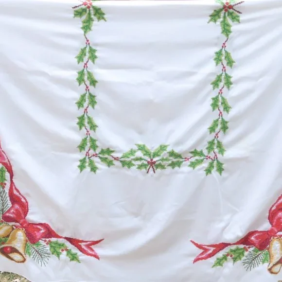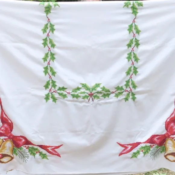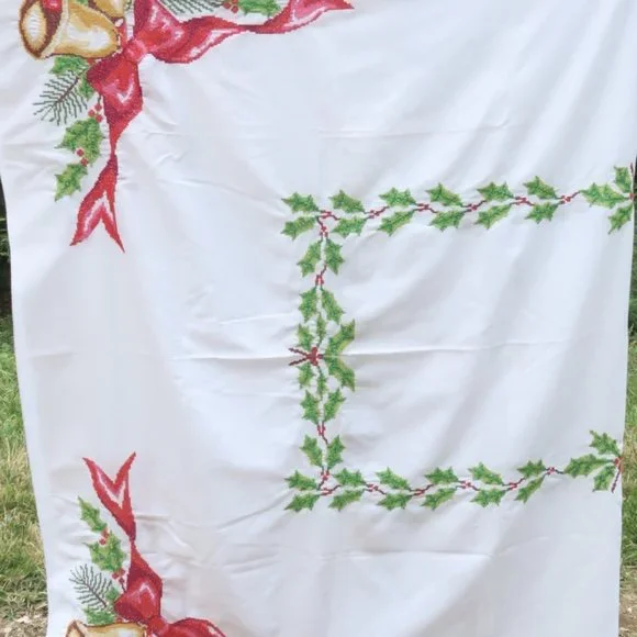 VTG Handmade Cross Stitched Tablecloth Christmas Bells Gold Red Green & 8 NapkinsSize:56" x 86". PLEASE NOTE:A small edge section frayed. Please see photos for item condition.PLEASE LOOK AT ALL PHOTOS AS THEY ARE PART OF ITEM CONDITION AND DESCRIPTION AND ASK ANY QUESTIONS BEFORE PURCHASING.SOLD AS IS.If you need additional photos, don't hesitate to ask.ALL SALES ARE FINAL.PLEASE NOTE:Handling time is 3 business days, which does not include weekend days.
