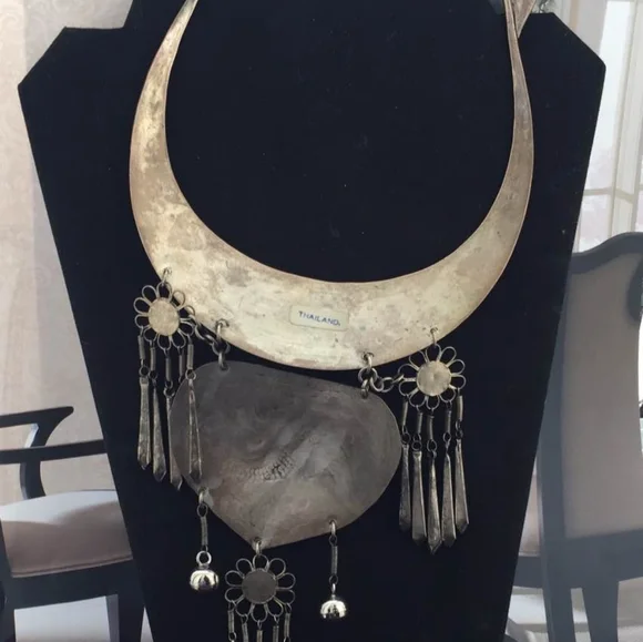 Rare! Huge Hill Tribe Necklacesilver tone tribal bib breastplate collar choker fish & birds etched Fringe figural Giant Artisan statement Runway BIG!Great condition! Inside circumference 16",unmarked. You're sure to get many compliments! Please look over the pictures for they are part of the description.We have a wide selection from 1800 - 1990's! We have something for everybody here at My Sales Rock! Check our shop, we might have something to Rock with your style!Don't forget to heart our shop to get updates in your newsfeed for our new arrivals!
